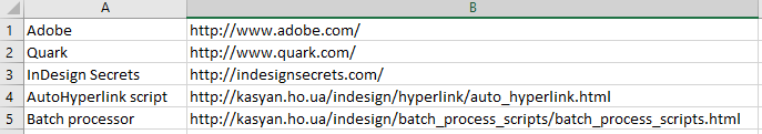 The script searches for every text entrance you defined in the first column, converting it to a hyperlink with a destination taken from the second column, and applies the"Hyperlink" character style to it.